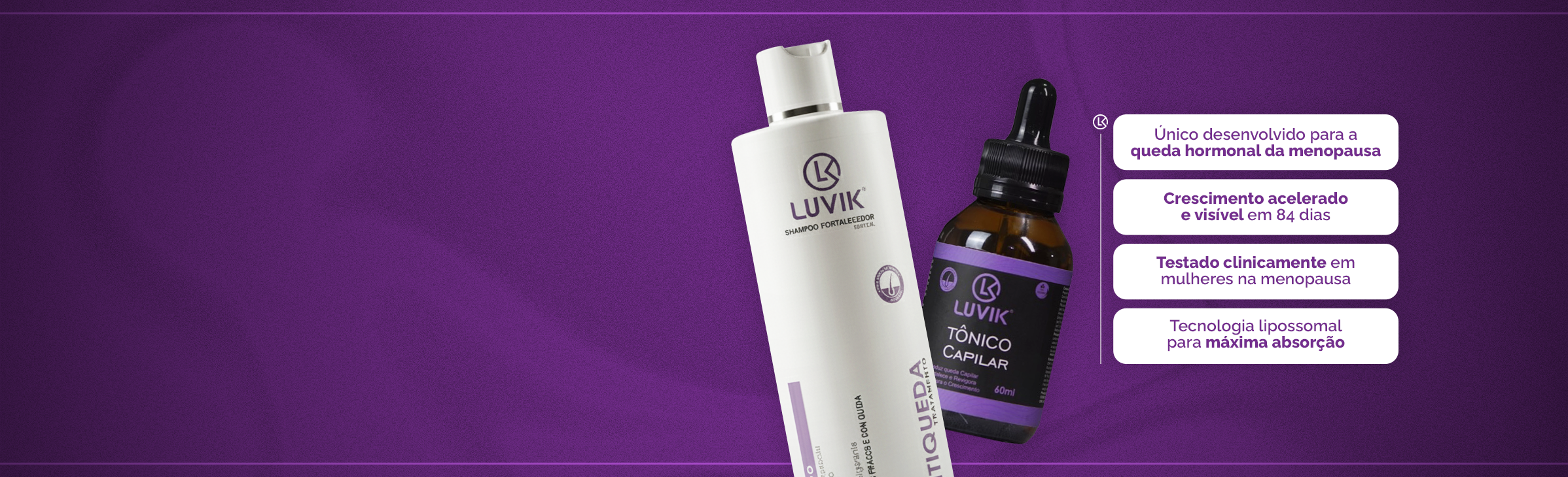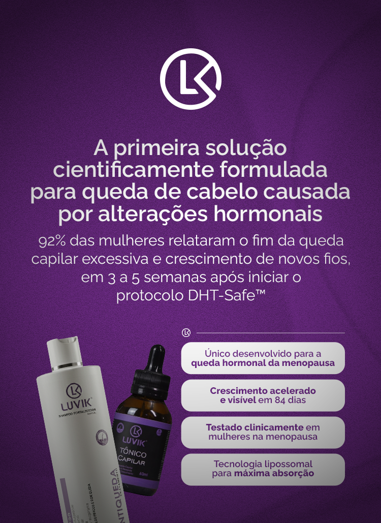 Luvik DHT-Safe™ é o primeiro sistema formulado especificamente para atuar na queda de cabelo causada por descontrole hormonal, reduzindo a sensibilidade da raiz e restaurando o ciclo natural de crescimento.